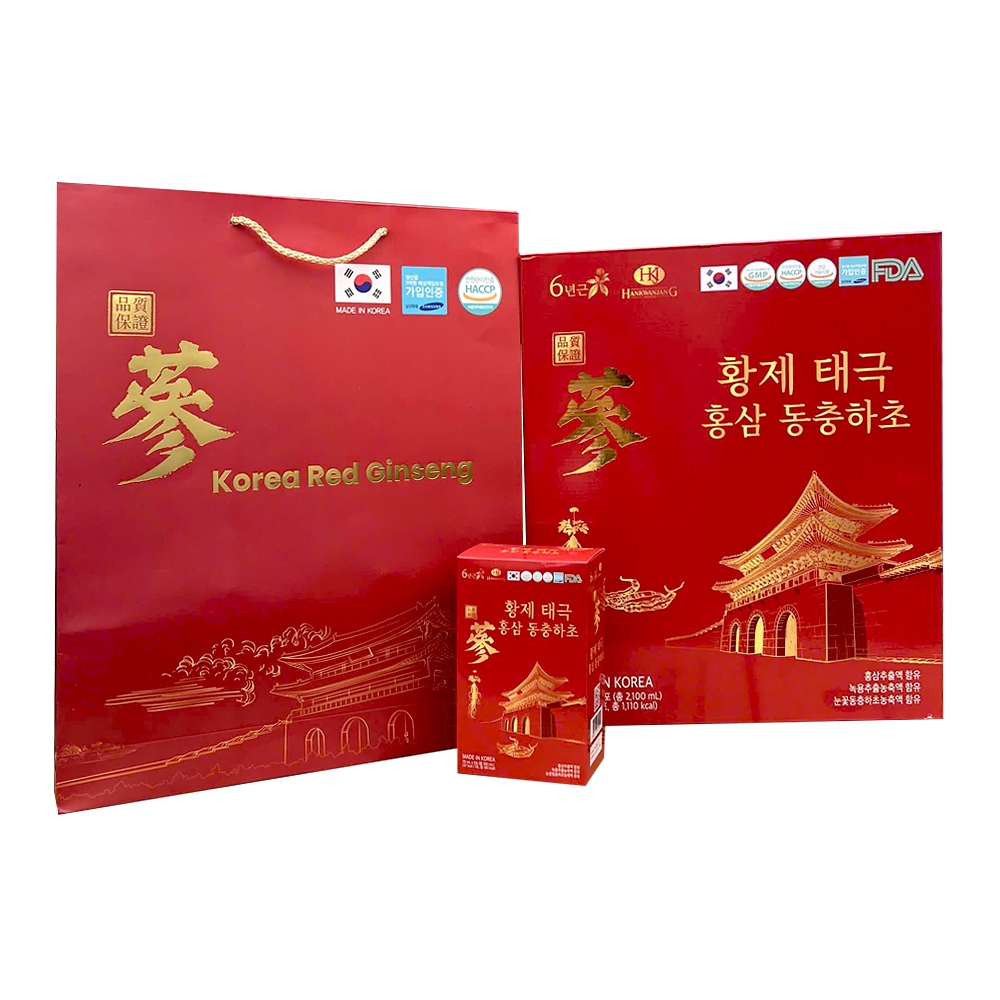 Nước Thiên Sâm Đông Trùng Hạ Thảo Hankwanjang Hàn Quốc (30 gói x 70ml) chứa thành phần đặc biệt gồm thiên sâm 6 năm tuổi cùng các dược thảo tự nhiên. Sản phẩm này được biết đến với nhiều công dụng như tăng cường sức đề kháng, giảm căng thẳng và mệt mỏi, cải thiện lưu thông khí huyết, chống lão hóa, làm đẹp da, tăng cường sinh lý, hỗ trợ gan và thận trong việc đào thải chất độc, giảm tác động của bia rượu lên gan, cũng như giảm các triệu chứng tiền mãn kinh ở phụ nữ. Ngoài ra, sản phẩm còn giúp tăng cường oxy trong cơ thể và cải thiện chức năng hô hấp.